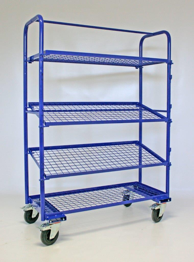 Voorzien van: 3 verstelbare etages en 4 zwenkwielen